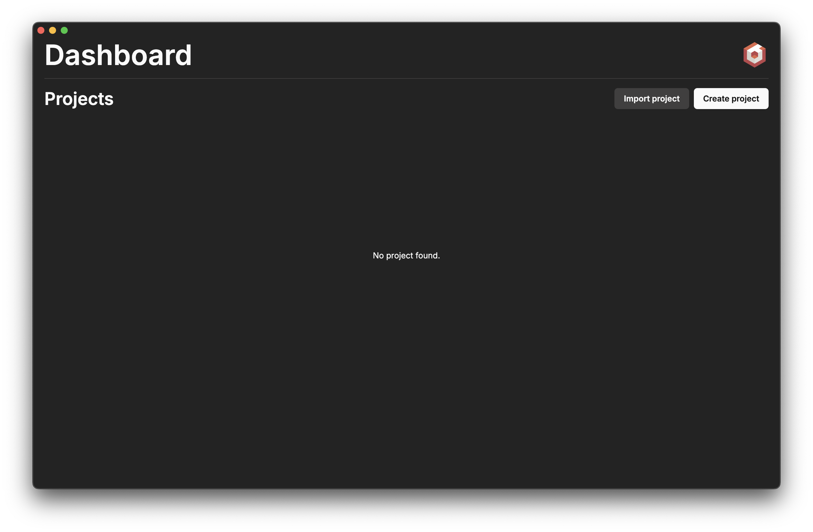 By default, the dashboard is empty showing no project has been found.